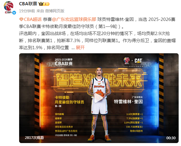 CBA官方写道:“恭喜广东男篮球员特雷维林-奎因,当选2025-2026赛季CBA联赛月度最佳防守球员(第1—9轮)。”