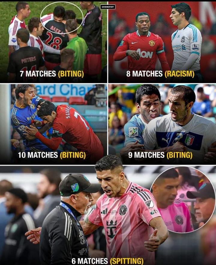 苏亚雷斯生涯中有过不少争议事件,他此前3次因咬人、1次种族歧视被禁赛。