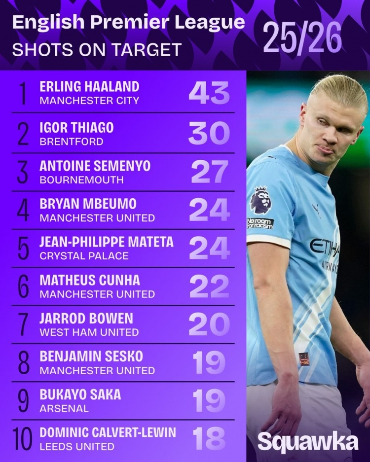 1月10日讯 数据机构squawka统计了本赛季英超射正情况,哈兰德居首。